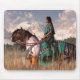 Eine Ureinwohnerfrau reitet einen Dun und weißes gepunktetes ein Mustangpferd durch ein Feld des hohen Grases. Weg in vom Abstand zeichnet ein Wald der Tannenbäume die Wiese. Hinter dem Wald das Scharfe, felsig, Schnee den Spitzenaufstieg umfaßte, der in den Himmel in dem wispy rosa Wolkenantrieb faul vorbei hoch ist. Ein leichter Wind brennt durch, die schwarze Mähne und den Schwanz des Pferds aufhebend. Ihr Sattel und Tracht sind beide Schwarzes mit Türkisfransen. Das sich wiederholende Symbol von Kokopelli, der Ergiebigkeitsgeist, füllen die offenen Räume des Materials. Kokopelli ist eine Ergiebigkeitsgottheit von den Ureinwohnerkulturen des Südwestens. Es wird theoretisiert, dass er nach einer wirklichen Art Person, einer Art reisender Kaufmann, Geschichtenerzähler, Reporter und Entertainer basiert. Sie konnten sagen, dass er der amerikanische Ureinwohner ist, der mit einem europäischen Barden, einem Troubadour oder einem minstral gleichwertig ist. Im Allgemeinen wird er allein dargestellt, aber in etwas Wiedergaben, hat er einen Gemahl oder eine Ehefrau, die als Kokopelmana oder Kokopelli-mana bekannt sind. Hier habe ich sie als wirkliche Person, ein reisender Geschichtenerzähler dargestellt, der ein Pferd durch den amerikanischen wilden Westen reitet.