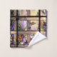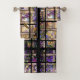 Herrliche Mischmediumcollage Kunst Nouveau der Vintagen Tiffany beflecktes Glasfenster-Wiedergabe der Clematis-und Kolibri-Rebe- Blumen auf einem Gitter, wenn die Vintagen Kolibri-Vögel dem Bild hinzugefügt sind, ist auf diesem Bad-Tuch-Set. Bild ist das public domain wegen des abgelaufenen Copyright. Die Kolibris sind nur auf dem Handtuch-und -wäsche-Stoff.