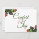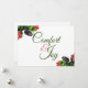 Hier ist eine einfache, aber elegante Botschaft für die Ferienzeit. Komfort und Freude. Diese Meldung befindet sich in einem Skripttyp-Schriftart. In den gegenüberliegenden Ecken der damaligen Karten gibt es immergrüne Zwiebeln mit Kiefern und Beeren. Auf der Rückseite der Karte befindet sich ein Textfeld, mit dem Sie Ihre eigene Urlaubsnachricht hinzufügen können. Wenn Sie es vorziehen, können Sie das Feld löschen und Ihre Nachricht schreiben.