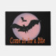 Kommen Sie zu einem Bite-Doormat mit schwarzen Vampir-Fledermäusen, die an einer dunklen Nacht herumfliegen, mit einem rosa Mond mit Lavendelring hinter ihnen. Schwarze Türmatte mit orangefarbenem Text, der lautet: "Komm rein für einen Biss." Sicher gruselig aber fügt einen lustigen und festlichen Flair für Halloween hinzu.
