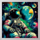 Ein einsamer Astronaut schwimmt im Weltraum vor dem lebendigen Hintergrund der Erde und zahlreicher Himmelskörper. Lebhafte Farben und komplexe Details erfassen die Weite und das Geheimnis des Universums.