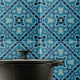 Diese Keramik-Kachel weist ein komplexes, symmetrisches kaleidoskopisches Muster auf, das sich in harmonischer Wiederholung entfaltet und einen faszinierenden visuellen Effekt erzeugt. Das Design zeichnet sich durch verschiedene Blautöne aus, von hell bis dunkel, die durch grau-schwarze Akzente schön kontrastiert sind. Das Muster besteht aus geometrischen Formen, die zu größeren, sternähnlichen Formationen zusammenkommen. Jedes Segment innerhalb des Musters ist aufwändig mit Steigungen und Schattierungen detailliert, was den dreidimensionalen Effekt verstärkt und eine Illusion von Tiefe und Bewegung verleiht. Der Stil dieser Kachel verbindet moderne Designelemente mit traditionellen Mosaikmustern, was zu einem visuell faszinierenden Stück führt.