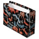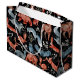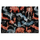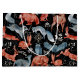 Illustrierte Waldtiere in Rot und Blau, darunter Füchse, Bären, Eulen und Hirsche, sind mit komplizierten Mustern auf schwarzem Hintergrund verziert.