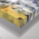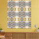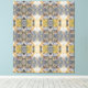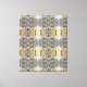 Ein symmetrisches Muster weist eine Farbmischung aus Grau, Gelb und Orange auf, wodurch ein kaleidoskopischer Effekt entsteht. Das sich wiederholende Design gibt ein Gefühl von Komplexität und Bewegung.