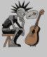 Ein Roboter mit spitzen Haaren und einem verwirrten Ausdruck sitzt auf einem Hocker und überlegt, wo sich das Plugin auf einer akustischen Gitarre verbindet. Die Denkblase über ihrem Kopf enthält einen Gitarrenplug und Fragezeichen, die Kontemplation und Verwirrung anzeigen.