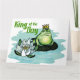 Ein Froschkönig mit einer Krone auf einem Blatt neben einer weißen Wasserlilie.