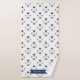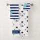 Tuch-Set mit drei Tüchern: ein Washcloth mit blauen Streifen der Marine und eine Illustration eines Eisbären mit einer Tatze drucken; ein gestreiftes Handtuch mit den selben schauen; und ein Badtuch, das ein Muster der Eisbären in Schwarzem, in weißem und Grau kennzeichnet. Personifizieren Sie mit dem Namen Ihr Kindes auf jedem Tuch.