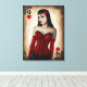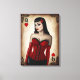 Pinup Stil Königin der Herzen Design mit Grunge-Effekte. Es zeigt eine schöne junge Frau, die ein rotes Korsett trägt, mit langen schwarzen Haaren.