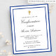 Eine moderne, elegante und bestätigte Einladung. Weiß mit königsblauen Rahmen und goldenem Kreuz. Personalisieren und fügen Sie einen Namen und Details. Schwarze Briefe, elegante handgeschriebene Stilschrift.