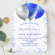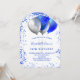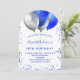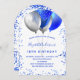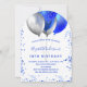 Ein weißer Hintergrund. Dekoriert mit königsblauen Imitaten Glitzer Tropfen malen tropfende Aussehen, Glitzern. Königlich blaue und Imitate silberne Ballons. Personalisieren und fügen Sie einen Namen und Party-Details hinzu. Der Name wird mit einem handgeschriebenen Stilskript geschrieben.