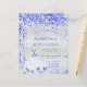 Ein Imitat silber aussehender Hintergrund. Die Glitzern sind mit königsblauen Konfetti dekoriert. Personalisieren und fügen Sie einen Namen und Party Details hinzu. Der Name wird mit einem handgeschriebenen Stilskript geschrieben.
