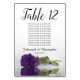 Diese Tischnummer-Karten machen es Ihren Gästen leicht, ihren Platz an Ihrem Hochzeitsempfang zu finden. Sie zeichnen sich durch ein schlichtes und dennoch elegantes Design aus, das mit einer laksigen Skriptkalligraphie und einer lila Single-Rose in königlichen Farben auf der Seite mit Wellenbrechern und Reflexionen liegt. Die Karte enthält eine Sitzkarte mit 10 Namen. Es gibt auch Platz für die Namen der Paare und das Hochzeitstag.
