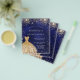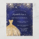 Bitte beachten Sie, dass diese Einladung auf Flyer Papier und sehr dünn ist. Umschläge sind nicht enthalten. Für dickere Einladungen (gleiche Gestaltung) besuchen Sie bitte unseren Shop. Eine trendige und glamouröse Einladung für eine Quinceañera, 15. Geburtstagsfeier. Ein marineblau Hintergrund mit Imitaten goldenen Glitzer Staub und ein Kleid. Die blaue Farbe ist ungleichmäßig. Der Name ist mit einem modernen handgeschriebenen Stilskript geschrieben. Personalisieren Sie Ihre Party-Daten und fügen Sie sie hinzu.