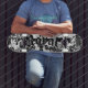 Nehmen Sie den königlichen Blutentwurf zur Straße mit unserem ersten Skateboard. Entwurf umfaßt den Golgotha Schädel, Kreuz, Schild, Engel mit einer Trompete und Palmen