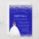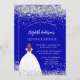 Eine moderne, stilvolle und glamouröse Einladung zu einer Quinceañera, 15. Geburtstagsfeier. Ein königsblauer Hintergrund mit Imitaten Glitzer Staub, ein Mädchen mit einem Kugelkrug. Der Name ist mit einem modernen handgeschriebenen Stilskript geschrieben. Personalisieren Sie Ihre Party-Daten und fügen Sie sie hinzu.
