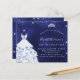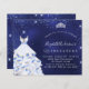 Eine moderne, stilvolle und glamouröse Einladung zu einer Quinceañera, 15. Geburtstagsfeier. Mitternachtsblauer Hintergrund mit Imitaten Glitzer Staub, Tiara und Kleid. Die blaue Farbe ist ungleichmäßig. Der Name ist mit einem modernen handgeschriebenen Stilskript geschrieben. Personalisieren Sie Ihre Party-Daten und fügen Sie sie hinzu.