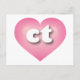 Auf dieser Postkarte befindet sich ein rosafarbenes Herz mit einem weiß gekalkten Zentrum mit fett gerundeten, weißen Kleinbuchstaben ct, einer spielerischen Version der Abkürzung für Connecticut, dem Staat der Konstitution. Die Rückseite der Karte ist leer und wartet auf Ihre handgeschriebenen Stimmungen oder Ihren personalisierten Text.