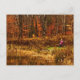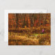 Diese Postkarte zeigt ein Kind in einer rosa Jacke auf einer Bank, die an einem coolen Herbsttag die Teichreflektionen in Betracht zieht. Die umliegenden Wälder sind in leuchtenden Farbtönen wie Rot, Orange, Gelb und Braun gehalten.