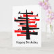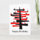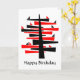 Ein abstrakter Baum in Rot und Schwarz mit kleinen Dreieckvögeln, die vielleicht im Morgengrauen singen. Zwei der Vögel, eine in Rot und eine in Schwarz, sitzen auf einem unteren Zweig. Aber natürlich ist die ganze Komposition wie eine Konversation in Form und Farbe. Der Baum ist vielleicht nicht anders als ein Zeder des Libanon. Laut dem sumerischen Epic von Gilgamesh wurden die Zedernwälder des Libanon als Wohnort der Götter angesehen. "Happy Birthday" vorne und innen (anpassbar) Eine kleinere Version des Hauptmotivs wird auch zur Dekoration des Innenraums verwendet.