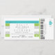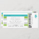 Passen Sie dieses lustige Ticket an und verkünden Sie Ihr Hochzeitsdatum auf fett und einzigartig! Farbtöne von Bright Aqua Blue und Lime Green mit Akzenten von Schwarz. Eine Mischung aus digitalen Schriftart für ein wahrhaftiges Konzert-Ticket-Gefühl. Drucken Sie auf der Rückseite zusätzliche Reise-, Unterkunfts- und/oder UAWG.
