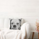 Dieses einzigartige schwarz-weiße Designerkissen zeigt die Köpfe eines weißen Bullenhundes. Das Bild auf diesem Kissen basiert auf einem Gemälde mit dem Titel "Boo the Bulldog".