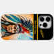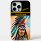 Ein indischer Krieger ist stolz auf eine warme Kulisse, in der er komplexe gefederte Kopfbedeckung, traditionellen Schmuck und einen starken Ausdruck zeigt, der sein Erbe und sein Erbe widerspiegelt. HINWEIS zum Ändern von Text- oder Grenzfarben mithilfe des Entwurfstools Bearbeiten