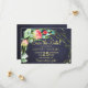 Moderne botanische Hochzeit bewahrt die Datumskartenvorlage mit den rote Rosen Rosa und Korallen mit aquamarinem blauem Blattwerk und goldenen Blätter auf dunkelblauen Kalkboard-Hintergrund Mitternacht. Ideal für einen rustikalen Land blumengeschmückten Frühling, Sommer oder Herbst Garten elegante Hochzeit.