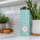 Unser mit Monogramm, individueller Tumbler in einer präparierten Korallen- und Aquafarbpalette zeichnet sich durch ein modernes, handgezeichnetes Quarrefolienmuster aus türkisfarbenem Wasser und Weiß aus, mit drei ersten Monogramm, die in der Kontrastpachy rosa Koralle in das Design eingebunden sind.