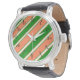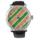 Diese Armbanduhr mit Korallen und grünen diagonalen Streifen macht eine fette Mode-Aussage.