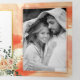 Korallenpfirsichfarben Blume und Blätter blumengeschmückte Winter dreimal Hochzeit Einladung. Dieses elegante Design zeigt eine goldene Rahmen- und korallenfarbene Blume mit sukkulenten und eukalyptusfarbenen Blätter an den oberen und unteren rechten Ecken und den goldfarbenen und schwarzen Text auf dem Cover. Die Innenfläche der ersten und letzten Paneele sowie die Außentafel beinhalten Fotos des Ehepaares, während die Innenseite des mittleren Panels Ihre Hochzeitsdetails zeigt. Die Rückseite zeigt Details über UAWG und mehr.