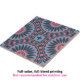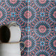 Diese Keramik-Kachel weist ein kompliziertes geometrisches Muster auf, das einen faszinierenden Kaleidoskop-Effekt bildet, der das Auge in die Mitte zeichne. Das Design ist symmetrisch, die Formen erinnern an Sterne und Blütenblätter. Die Farbpalette ist auffallend, und ein tiefblaues Marineblau bildet die Basis des Designs. Die Farbtöne Türkis und Korallenrosa verleihen dem Raum einen ansprechenden Kontrast. Jede Form innerhalb des Musters ist sorgfältig umrissen und fügt dem Design Tiefe und Dimension hinzu.