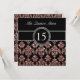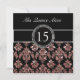 Girly, Spaß dennoch hoch entwickelte Quinceanera Einladungs-personalisierter schwarzer Damast mit korallenrotem rosa Glitterdruckeffekt. Entwurf durch Elke Clarke©. Grafiken genehmigt für Gebrauch.