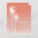 Eine Strandhochzeits-Probenabendesseneinladung, die eine Illustration von zwei weißen Palmen an links über einem korallenroten ombre Hintergrund kennzeichnet. Personifizieren Sie den weißen Text.
