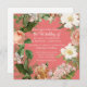 Heller, fröhlicher "Living Coral" Hintergrund mit weißem Text und eine quadratische Einladung (Sie können beide Optionen ändern) für eine moderne Hochzeit mit zeitlosen Touchs. Audrey Jeanne Roberts entwarf diesen eleganten Kranz aus Vintagen botanischen Illustrationen von Blume und Blattwerk. In den Farben der Rose von Rost und Elfenbein, Clematis und Peony Blumen mit wilden Farnen und mit Blattwerk Kranz. Urheberrecht.