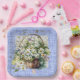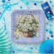Eine quadratische Papiertafel, die mit einem Korb weißer Daisy-Blume auf einem Hintergrund mit blauer Wäsche für jede Art von Party-Feier entworfen wurde