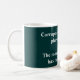 Eine dunkeltürkisfarbene und weiße Tasse mit lateinischer Phrase und der englischen Übersetzung darunter. "Der korrupteste Staat hat die meisten Gesetze", von den römischen Terence.