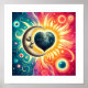 Dieses faszinierende Kunstwerk mit dem Titel "Cosmic Embrace: The Heart of the Universe" zeigt ein Himmelsphänomen, bei dem Sonne und Mond sich ausrichten, um eine herzförmige Sonnenfinsternis zu schaffen. Die Sonne, die von Rot bis Gelb strahlt, umrahmt die Hälfte des Herzens, während die coolen, ruhigen Mondfarben das andere ergänzen, das Set vor dem Hintergrund eines sternvollen Raumes. Das Gesicht auf dem Halbmond verleiht der Szene eine ruhige und mystische Touch, die den friedlichen Schlummer des Kosmos verkörpert. Wirbel von Sternen und Himmelskörpern tanzen in einer harmonischen Mischung von Farben und Formen, die Gefühle von Liebe und Einheit in kosmischem Maßstab hervorruft. Perfekt für jeden, der die Schönheit des Universums schätzt oder Kunstwerke genießt, die Fantasy-Elemente mit kosmischen Phänomenen verbinden.
