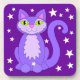 Eine lächelnde lila Katze mit vielen Sternen, niedliche Cartoon Kätzchen, lila Hintergrund, originelle Kunstwerke. Sie können die Hintergrundfarbe ändern, wenn Sie möchten - anpassen -> bearbeiten -> Hintergrund.
