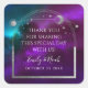 Kosmische Lila Aquamarine Silver Sun Moon Astronomie Gastgeschenk Hochzeit Sticker zeigt silberne Sonne, Mond und Sterne mit einem silbernen Rahmen auf einem farbenprächtigen mystischen lila, aquamarinen und blauen kosmischen Hintergrund. Personalisiert mit einer "Danke"-Nachricht. Ideal für Hochzeiten und Gastgeschenke. Personalisieren Sie den Text durch Bearbeiten in den bereitgestellten Textfeldern. Entwickelt für Sie durch © Evco Studio www.zazzle.com/store/evcostudio
