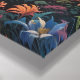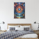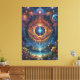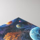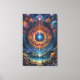 Dieses pulsierende Kunstwerk besticht durch eine faszinierende kosmische Szene, die Fantasy- und Meditationselemente kombiniert. In der Mitte strahlt eine leuchtende, verzierte mandalaähnliche Struktur in orangen, blauen und lila Farbtönen aus, was auf ein Portal oder einen Mittelpunkt für Meditation hindeutet. Um diese zentrale Figur herum befinden sich Himmelskörper, einschließlich Planeten und Sterne, die reich an Details und Farben dargestellt sind und ein Gefühl für die Weite des Raumes wecken. Der untere Teil des Bildes zeigt eine ruhige Landschaft mit Bergen und Bäumen unter einem Nachthimmel, wo zwei silberne Figuren zum Wasser sitzen, möglicherweise in Meditation oder Kontemplation. Dieses Stück verbindet wunderbar natürliche und mystische Elemente und schafft eine Atmosphäre, die sowohl ruhig als auch beeindruckend inspiriere.