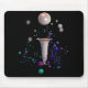 Ein zentrales Trompet-ähnliches Objekt, umgeben von farbenfrohen Kugeln und Sternexplosionen, ist das Set vor einem schwarzen Hintergrund. Die Anordnung gibt ein Gefühl der schwebenden oder kosmischen Zerstreuung.