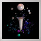Ein zentrales Trompet-ähnliches Objekt, umgeben von farbenfrohen Kugeln und Sternexplosionen, ist das Set vor einem schwarzen Hintergrund. Die Anordnung gibt ein Gefühl der schwebenden oder kosmischen Zerstreuung.