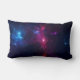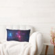 Ein Lumbalkissen mit einem blauen, rosa und schwarzen Fantasiebild kosmischer Räume mit Sternen und kluger Nebel.