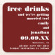 Vergnügen Sie sich, Ihre Daten zu speichern! Der Text ist alle rechts ausgerichtet, mit fett weißer Typografie auf bordeauxrotem Hintergrund, mit dem Slogan Free Drinks und Wir werden auch verheiratet. Vollständig käuflich. Sie können Text und Hintergrund in verschiedene Farben ändern, wenn Sie dies wünschen, indem Sie die Option Weitere anpassen wählen.