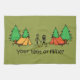 Fun Camping Handtuch gedruckt mit einem Stock Cartoon Paar neben ihren Campingzelten und die Worte Ihre Zelt oder meine?
