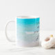 Ein Ruhestandspreis, auf einem ikonischen Bild von Strand und Meer, ist der Hintergrund dieses maßgeschneiderten Ruhestandsgeschenks. Blues und Sandfarben. Ihr Name wird einfach in die Tasse eingegeben oder ganz entfernt.