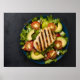 Köstliche gesunde Ernährung: Grilltes Huhn mit Tomate und Avocado Salat. Genießen Sie eine ausgewogene und nahrhafte Mahlzeit mit gegrilltem Hühnchen, gepaart mit einem frischen Salat reifer Tomaten und cremigem Avocado.