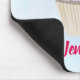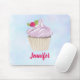 Ein personalisiertes Mousepad mit einem trendigen Schriftart. Entworfen mit einer Illustration eines leckeren Kuchens mit rosa Wirbel und einer Beere mit Blätter im Zuckerguss eingebettet. Set auf hellblauem pastellfarbenem Aquarell.