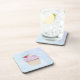 Untersetzer mit einer Illustration eines köstlichen Kuchen mit rosa Wirbel und einer Beere mit Blätter im Zuckerguss eingebettet. Set auf hellblauem pastellfarbenem Aquarell.