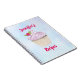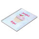 Nimm deine Lieblingsrezepte in diesem Spiralheft auf. Personalisiert mit Ihrem Namen in einem niedlichen trendigen Schriftart. Entworfen mit einer Illustration eines leckeren Kuchens mit rosa Wirbel und einer Beere mit Blätter im Zuckerguss eingebettet. Set auf hellblauem pastellfarbenem Aquarell.